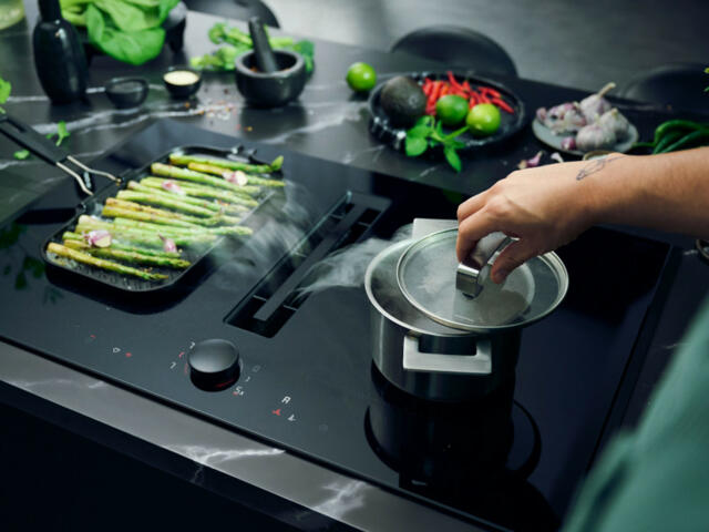 Unser revolutionärer Kochfeldabzug vereint alle bekannten Funktionen von NEFF, wie das vielseitige Twist Pad Flex®, die flexible Flex Induction, die leistungsstarke Power Transfer-Funktion und den Bratsensor 70° bis 220 °C. Der integrierte Dunstabzug zieht Dampf und Gerüche direkt am Ort ihres Entstehens ein - direkt auf dem Kochfeld.