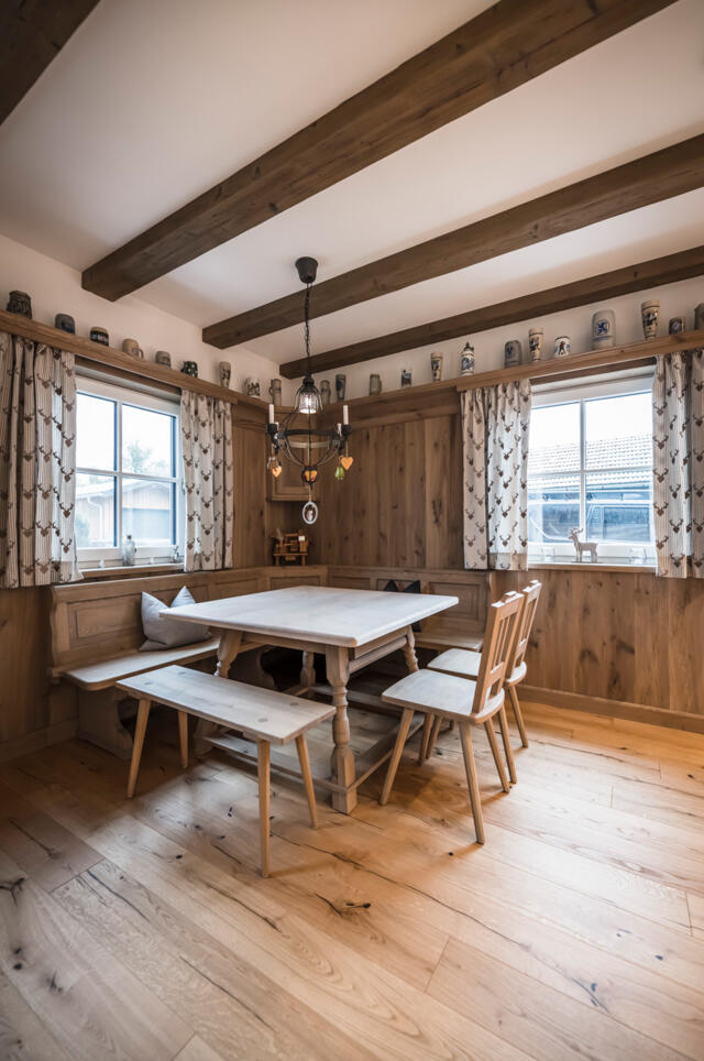 Genießen Sie das Zusammensein an unserem Joggeltisch, umgeben von einer Wandverkleidung in gehackter Eiche. An der klassischen Eckbank erleben Sie traditionelle Gemütlichkeit und rustikalen Charme in Ihrem Zuhause.