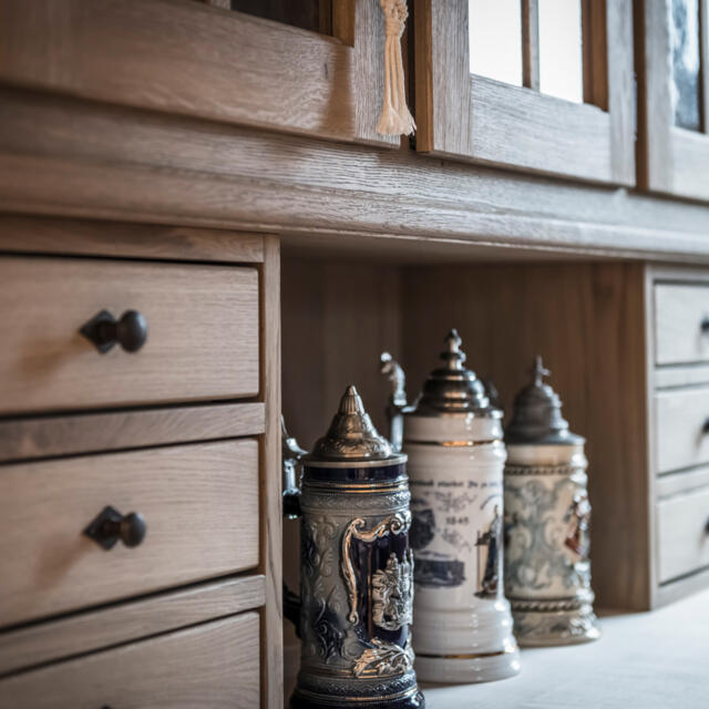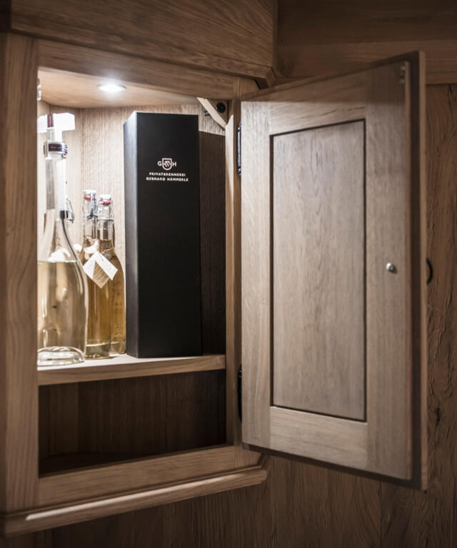Für die Verdauung nach dem Essen oder am Ende einer geselligen Runde darf ein Schnaps nicht fehlen. Er steht beleuchtet und griffbereit im klassischen Eckschrank über der Schnupfmaschine.