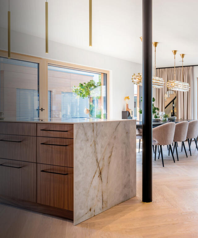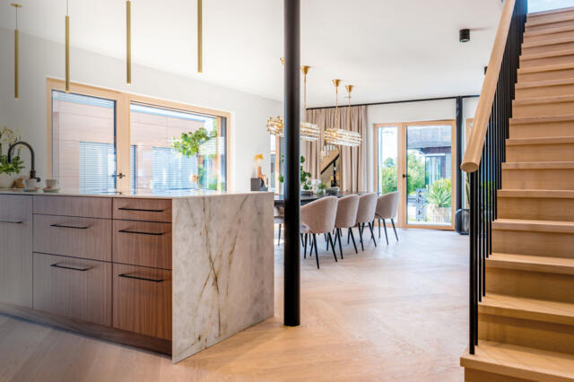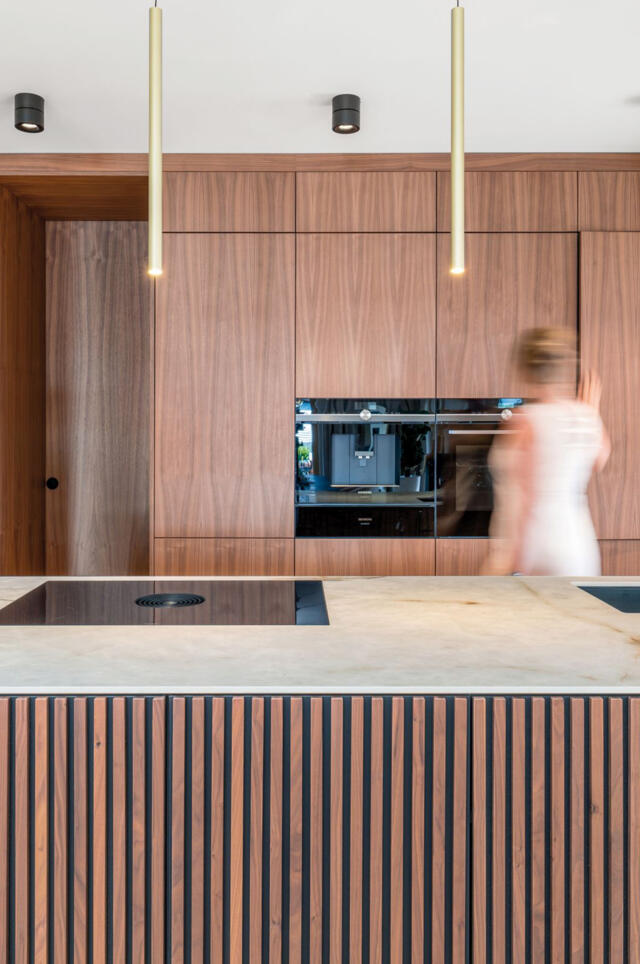 Die Nussbaumlamellen schaffen nicht nur eine ansprechende Optik, sondern auch zusätzliche räumliche Tiefe. Hinter ihnen verbirgt sich praktischer Stauraum für Geschirr.